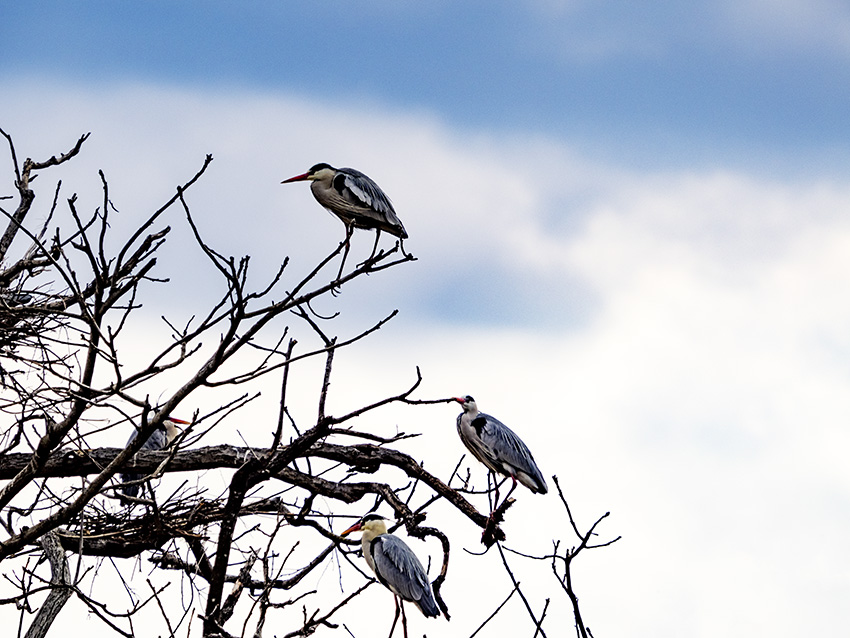 アオサギは高所にコロニーがあるので間違いなく天を仰いで撮影します。巣を守る鳥のもとに長い藁を咥えた