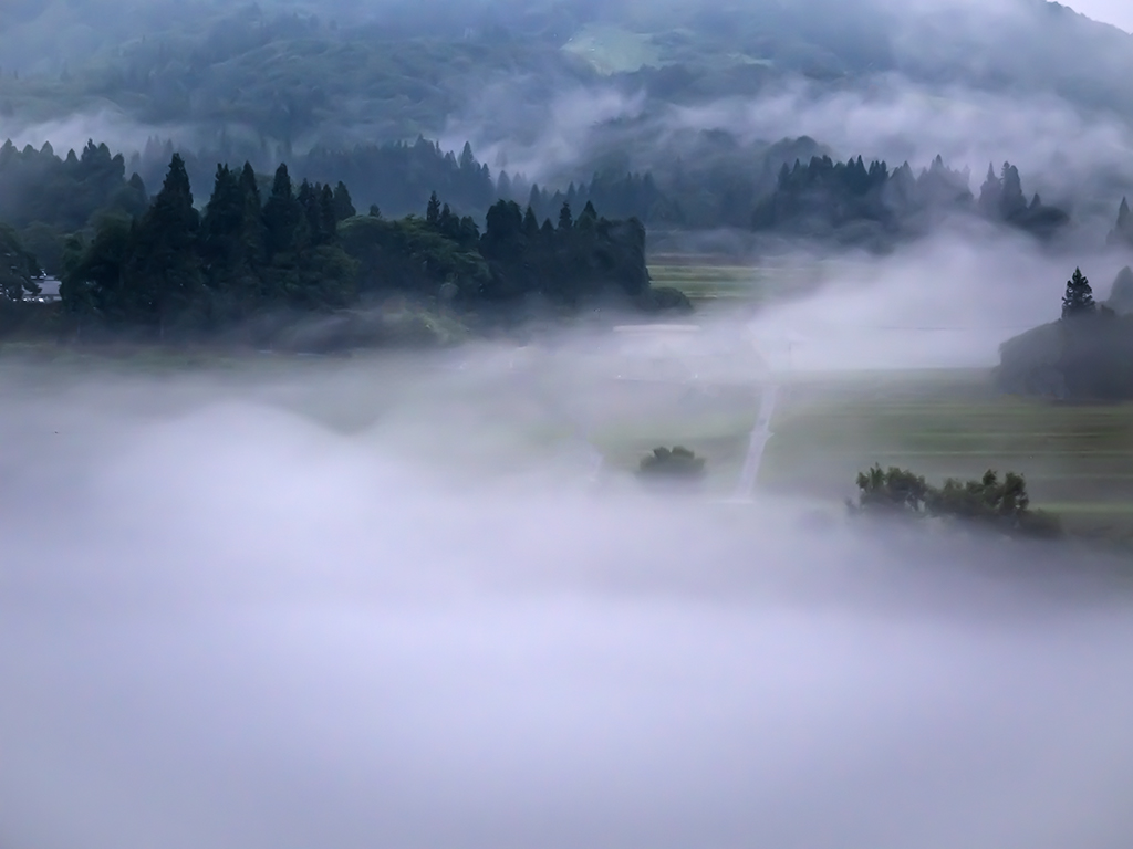 画面半分から下は只見川が流れていますが濃厚な川霧で全てが隠されてしまいました。